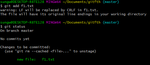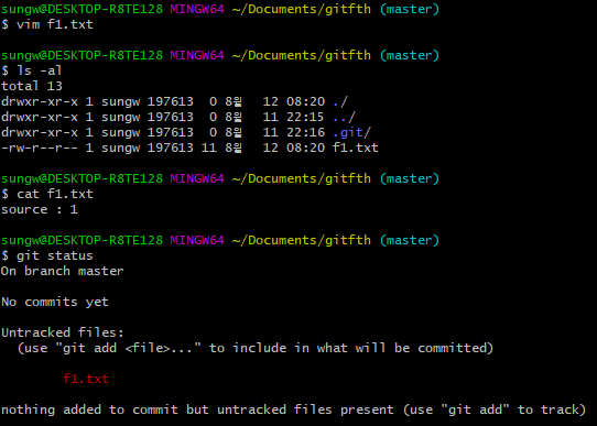위 사진처럼 Untracked files : f1.txt 이라고 나옵니다.