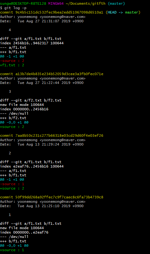 버전 2를 설명하자면 f1.txt 파일의 코드 source : 1 이 없어지고 source : 2 가 추가 되었다.