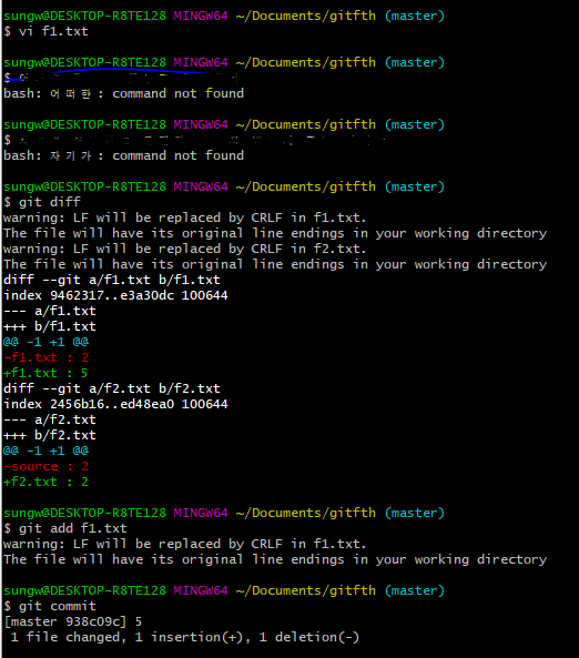 commit 할때 f1.txt 변경된것은 source : 1 이다.